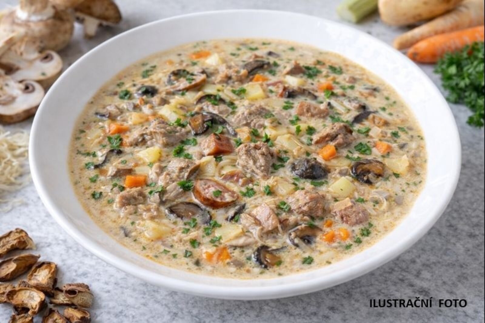 Hustá, krémová polévka, která zasytí. Poctivý základ se spoustou masa, houbami, kořenovou zeleninou a smetanou. Výrazná, plná chuti, lehce nakysla.