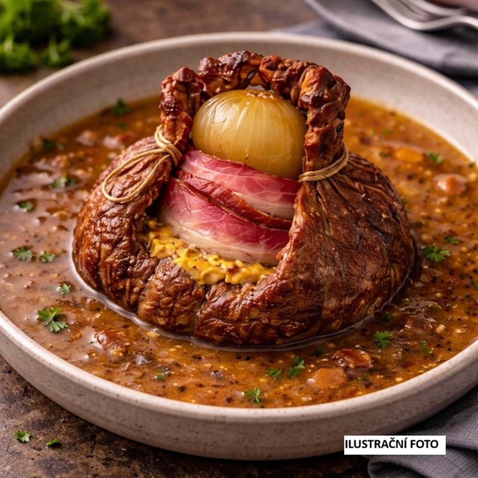 Poctivá specialita, co si na nic nehraje. Šťavnaté maso stočené do měšce, plněné výraznou kombinací hořčice, slaniny a cibule. Chuťově přímočaré jídlo, kde se potkává síla masa s typickou slezskou náplní.